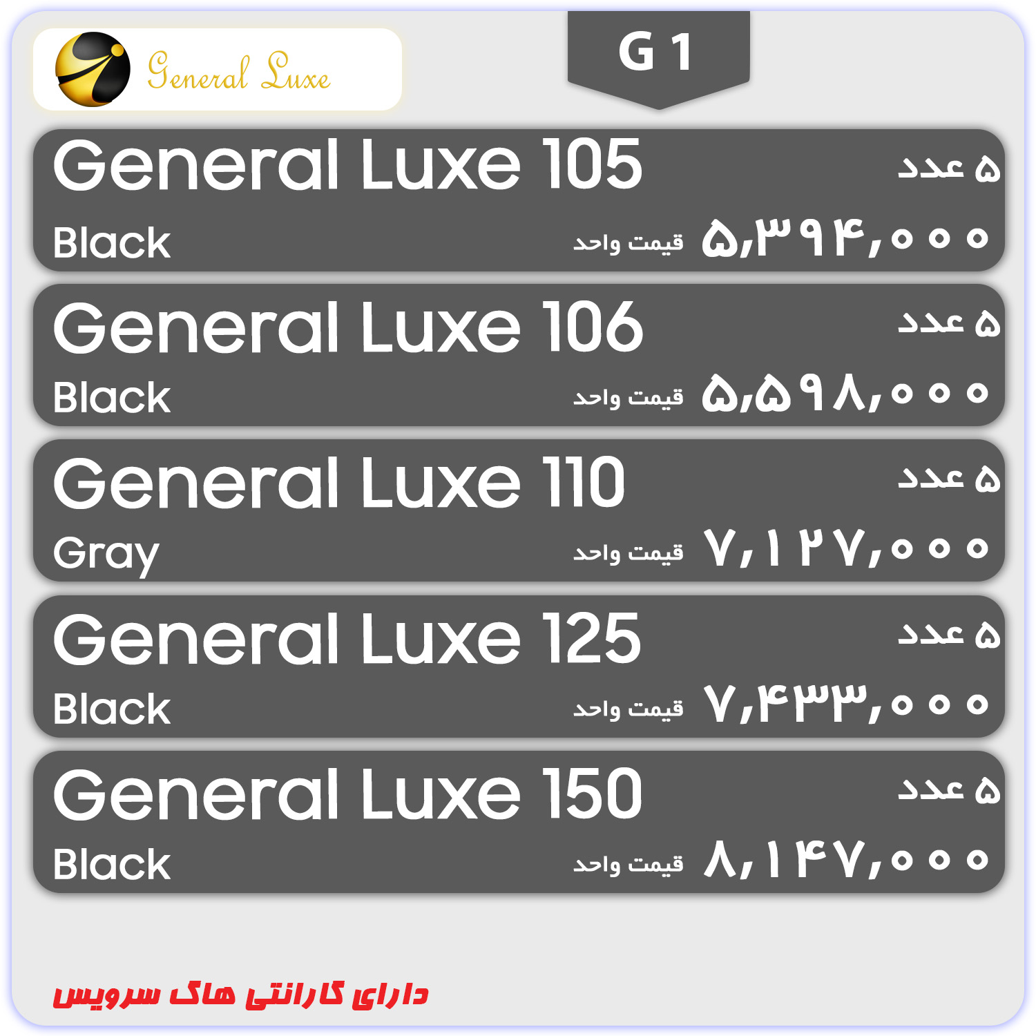 برند جنرال لوکس (General Luxe) با هدف تولید گوشی تلفن همراه و تبلت در بسیاری از کشورهای دنیا به ثبت رسیده است. محصولات این برند در منطقه تجاری اروند (ایران) تولید شده و با هدیه انفورماتیک گستر (هاگ سرویس) عرضه می شوند. بر اساس این سرویس، تمامی تلفنهای همراه برند جنرال لوکس دارای 24 ماه گارانتی، 12 ماه گارانتی حوادث، 30 روز گارانتی تعویض، و حمل رایگان (در تهران) توسط شرکت همراه سرویس خاور میانه می باشند.